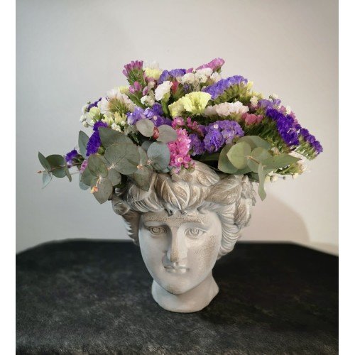 Busto de resina ,de inspiración clásica que también sirve de pequeño macetero,con arreglo de siemprevivas.Este arreglo tiene una muy buena duración .